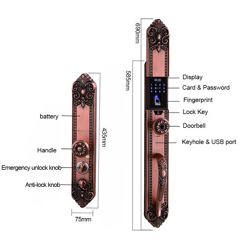 • User capacity: 50 fingerprints + 100 cards + 100 codes